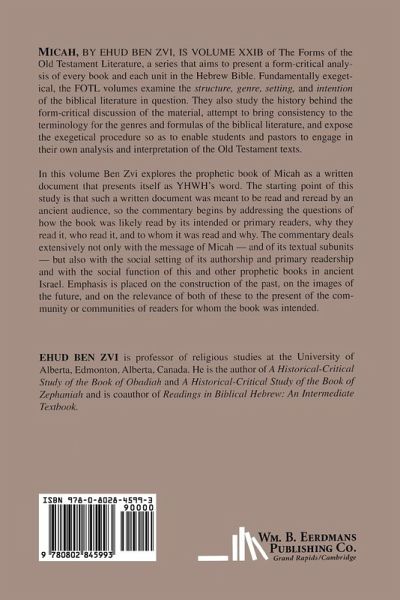 Ehud Ben Zvi explores the prophetic book of Micah as a written document that presents itself as YHWH’s word. He examines how Micah was read by its ancient audience and explores the social setting upon which the biblical book stands. Emphasis is placed on the construction of the past, on the images of the future, and on the relevance of both of these to the current community of readers for whom the book was intended. The commentary not only deals extensively with the message of Micah but with the social function of this and other prophetic books in ancient Israel. Ben Zvi’s various lines of investigation lead to a deeper understanding of Micah and its enduring message.