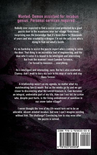 Wanted: Demon assistant for incubus genius. Personal services required... Nobody ever expected to find a secret cave protected by a giant puzzle door in the mountains near our village. Even more surprising was the knowledge that it's been there for thousands of years and was created by a dragon. I'm not the only one who's dying to find out what's inside. It's no hardship to assist the puzzle expert who's coming to solve the door. That thing is an incredible feat of engineering, and the man who'll solve it is bound to be intelligent and interesting. But from the moment I meet Camden Torrence, I'm forced to reassess... everything. He's intelligent and interesting, sure. But he's also scattered. Clumsy. And I want to bury my face in his mop of curls and stay there forever. A relationship wasn't on my agenda, no matter what my matchmaking family wants. But as the weeks go by and we get closer to discovering what the secret treasure is, Cam becomes an integral, undeniable part of my life. How can I not fall for a man who, despite past hurts, is the living embodiment of sunshine in our snow-laden village? I never thought the love of my life would turn out to be an adorable, absent-minded incubus, but now I can't imagine existing without him. The challenge? Convincing him to stay even after the puzzle is solved.