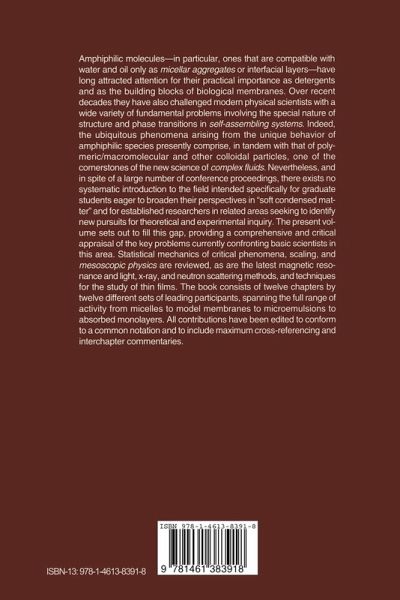 1 Statistical Thermodynamics of Amphiphile Self-Assembly: Structure and Phase Transitions in Micellar Solutions.- 1.1 Introduction.- 1.2 Amphiphile Self-Assembly in Dilute Solutions.- 1.3 Molecular Organization of Aggregates.- 1.4 Interaction Effects in Dilute Solution and Beyond.- 1.5 Concluding Discussion.- 2 Micellar Growth, Flexibility and Polymorphism in Dilute Solutions.- 2.1 Introduction.- 2.2 Globule to Rod Transformation.- 2.3 Polymerlike Behavior.- 2.4 Bidimensional Aggregation.- 2.5 The Physical Basis of Micellar Polymorphism.- 2.6 Connection with Microemulsions.- 3 Micellar Liquid Crystals.- 3.1 Introduction.- 3.2 Nomenclature.- 3.3 Preparation of Stable Nematic Phases.- 3.4 Factors Governing Size and Shape of Micelles in Concentrated Solutions.- 3.5 Experimental Characterization of Nematic Phases.- 3.6 Phase Transitions in Micellar Solutions.- 3.7 Conclusions.- 4 Geometrical Foundation of Mesomorphic Polymorphism.- 4.1 Introduction.- 4.2 Mesophases as Structures of Films.- 4.3 Frustration, Curved Spaces and Disclinations.- 4.4 The Periodic System of Parallel Films.- 4.5 Comments.- 4.6 Conclusion.- 4.7 Appendix.- 5 Contents Lamellar Phases: Effect of Fluctuations (Theory).- 5.1 Introduction.- 5.2 Model of Isolated Membranes.- 5.3 Membranes in Interaction.- 5.4 Conclusion.- 5.5 Appendix.- 6 Lyotropic Lamellar L? Phases.- 6.1 Introduction.- 6.2 Phase Diagrams.- 6.3 Membranes and Smectic Properties.- 6.4 Static Scattering Studies of Lyotropic Lamellar Phases...- 6.5 Dynamic Light Scattering.- 6.6 Conclusion.- 7 The Structure of Microemulsions: Experiments.- 7.1 Introduction.- 7.2 The Interfacial Film of Surfactant.- 7.3 Dilute Microemulsions.- 7.4 Structure of Concentrated Microemulsions.- 7.5 Conclusions.- 7.6 Appendix: X-ray and Neutron Scattering.- 8Lattice Theories of Microemulsions.- 8.1 Introduction: Aims of a Lattice Theory of Microemulsions.- 8.2 The Lattice Formulation.- 8.3 Some Results of the Three Component Model.- 8.4 Some Results of Other Lattice Models.- 8.5 Comparison with Phenomenological Models.- 9 Fluctuating Interfaces and the Structure of Microemulsions.- 9.1 Introduction.- 9.2 Experimental Observations and Theoretical Models.- 9.3 Fluctuation of Microemulsions.- 9.4 Lamellar and Random/Bicontinuous Systems.- 9.5 Outstanding Problems.- 10 Interfacial Tension: Theory and Experiment.- 10.1 Introduction.- 10.2 Experimental Techniques and Data Analysis.- 10.3 The Bending Elasticity of Monolayers: Experimental Results.- 10.4 Experimental Study of Low Surface Tensions in Winsor Equilibrium.- 10.5 Structure of the Oil Microemulsion and the Water Microemulsion Interfaces in Winsor Equilibria.- 11 Critical Behavior of Surfactant Solutions.- 11.1 Introduction.- 11.2 Structure and Interactions.- 11.3 Critical Phenomena.- 11.4 Conclusion.- 12 Structures and Phase Transitions in Langmuir Monolayers.- 12.1 Introduction.- 12.2 The Experimental Situation.- 12.3 Equilibrium Theories of Monolayers.- 12.4 Dynamical Properties of Amphiphilic Monolayers.- 12.5 Conclusions and Future Prospects.