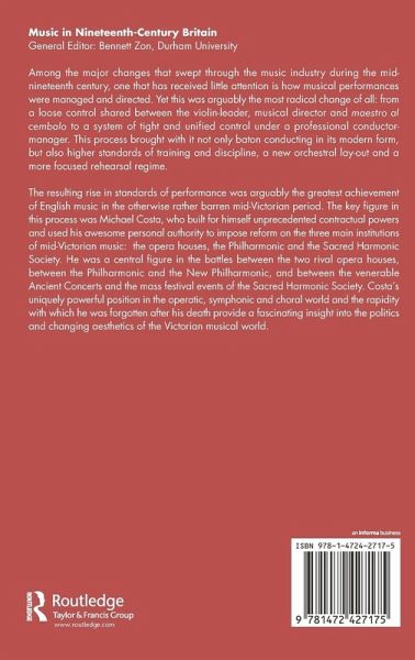 Among the major changes that swept through the music industry during the mid-nineteenth century was how musical performances were managed and directed. From a loose control shared between the violin-leader, musical director and maestro al cembalo to a system of tight and unified control under a professional conductor-manager. This process brought with it not only baton conducting in its modern form, but also higher standards, a new orchestral lay-out and a more focused rehearsal regime. The key figure in this process was Michael Costa whose uniquely powerful position in the operatic, symphonic and choral worlds provide a fascinating insight into the politics and changing aesthetics of the Victorian musical landscape.