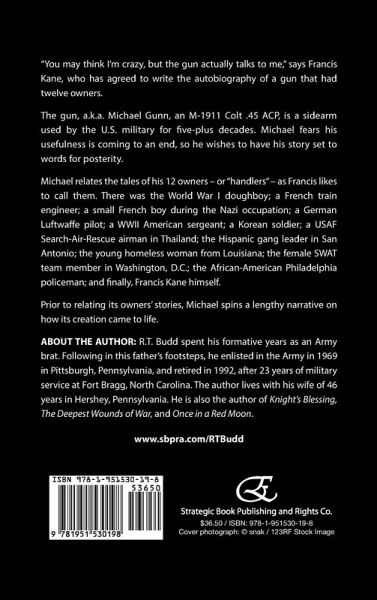 "You may think I’m crazy, but the gun actually talks to me," says Francis Kane, who has agreed to write the autobiography of a gun that had twelve owners. The gun, a.k.a. Michael Gunn, an M-1911 Colt .45 ACP, is a sidearm used by the U.S. military for five-plus decades. Michael fears his usefulness is coming to an end, so he wishes to have his story set to words for posterity. Michael relates the tales of his 12 owners – or "handlers" – as Francis likes to call them. There was the World War I doughboy; a French train engineer; a small French boy during the Nazi occupation; a German Luftwaffe pilot; a WWII American sergeant; a Korean soldier; a USAF Search-Air-Rescue airman in Thailand; the Hispanic gang leader in San Antonio; the young homeless woman from Louisiana; the female SWAT team member in Washington, D.C.; the African-American Philadelphia policeman; and finally, Francis Kane himself. Prior to relating its owners’ stories, Michael spins a lengthy narrative on how its creation came to life. About the Author: R.T. Budd spent his formative years as an Army brat. Following in this father’s footsteps, he enlisted in the Army in 1969 in Pittsburgh, Pennsylvania, and retired in 1992, after 23 years of military service at Fort Bragg, North Carolina. The author lives with his wife of 46 years in Hershey, Pennsylvania. He is also the author of Knight’s Blessing, The Deepest Wounds of War, and Once in a Red Moon.