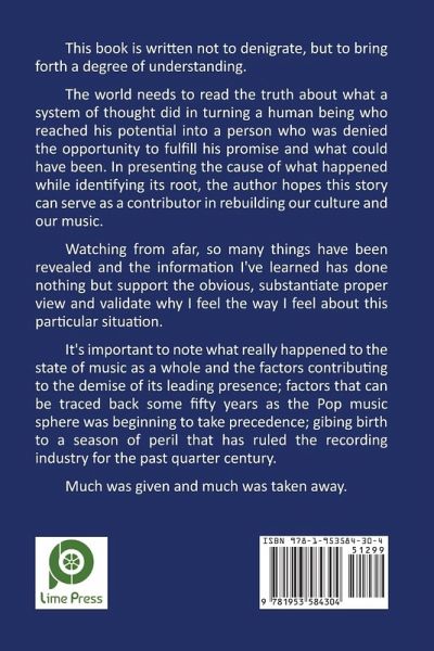 This book is written not to denigrate, but to bring forth a degree of understanding. The world needs to read the truth about what a system of thought did in turning a human being who reached his potential into a person who was denied the opportunity to fulfill his promise and what could have been. In presenting the cause of what happened while identifying its root, the author hopes this story can serve as a contributor to rebuilding our culture and our music. Watching from afar, so many things have been revealed and the information I've learned has done nothing but support the obvious, substantiate proper view, and validate why I feel the way I feel about this particular situation. It's important to note what really happened to the state of music as a whole and the factors contributing to the demise of its leading presence; factors that can be traced back some fifty years as the Pop music sphere was beginning to take precedence; giving birth to a season of peril that has ruled the recording industry for the past quarter-century. Much was given and much was taken away.
