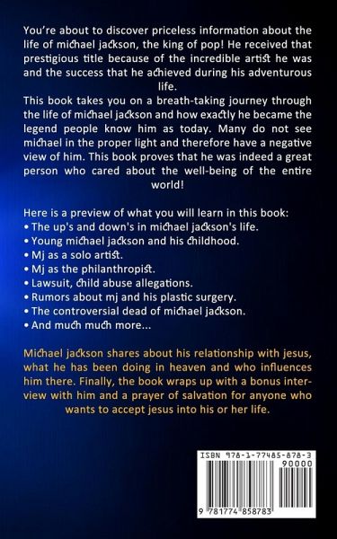 You're about to discover priceless information about the life of michael jackson, the king of pop! He received that prestigious title because of the incredible artist he was and the success that he achieved during his adventurous life. This book takes you on a breath-taking journey through the life of michael jackson and how exactly he became the legend people know him as today. Many do not see michael in the proper light and therefore have a negative view of him. This book proves that he was indeed a great person who cared about the well-being of the entire world! Here is a preview of what you will learn in this book:The up's and down's in michael jackson's life. Young michael jackson and his childhood. Mj as a solo artist. Mj as the philanthropist. Lawsuit, child abuse allegations. Rumors about mj and his plastic surgery. The controversial dead of michael jackson. And much much more... Michael jackson shares about his relationship with jesus, what he has been doing in heaven and who influences him there. Finally, the book wraps up with a bonus interview with him and a prayer of salvation for anyone who wants to accept jesus into his or her life.