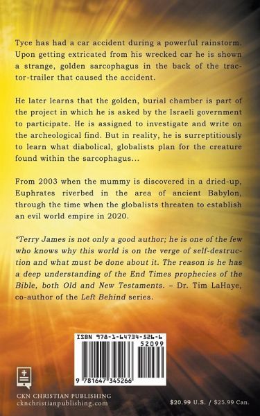 "From the first novel, REVELATIONS - Tyce Greyson is a journalist with a background of having strange visions due to a serpent's bite suffered while on Patmos, the Aegean island where the Prophet John received the Revelation. Now, Tyce has had a car accident during a powerful rainstorm. Upon getting extricated from his wrecked car he is shown a strange, golden sarcophagus in the back of the tractor-trailer that caused the accident. He later learns that the golden, burial chamber is part of the project in which he is asked by the Israeli government to participate. He is assigned to investigate and write on the archeological find. But in reality, he is surreptitiously to learn what diabolical, globalists plan for the creature found within the sarcophagus... From 2003 when the mummy is discovered in a dried-up, Euphrates riverbed in the area of ancient Babylon, through the time when the globalists threaten to establish an evil world empire in 2020. "Terry James is not only a good author; he is one of the few who knows why this world is on the verge of self-destruction and what must be done about it. The reason is he has a deep understanding of the End Times prophecies of the Bible, both Old and New Testaments. For they alone reveal the wonderful plan God has for the future of mankind today and for our eternal future." - Dr. Tim LaHaye, co-author of the Left Behind series"--
