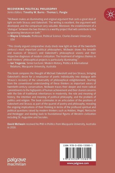 This book compares the thought of Michael Oakeshott and Leo Strauss, bringing Oakeshott's desire for a renaissance of poetic individuality into dialogue with Strauss's recovery of the universality of philosophical enlightenment. Starting from the conventional understanding of these thinkers as important voices of twentieth-century conservatism, McIlwain traces their deeper and more radical commitments to the highpoints of human achievement and their shared concerns with the fate of traditional inheritances in modernity, the role and meaning of history, the intention and meaning of political philosophy, and the problem of politics and religion. The book culminates in an articulation of the positions of Oakeshott and Strauss as part of the quarrel of poetry and philosophy, revealing the ongoing implications of their thinking in terms of the profound spiritual and political questions raised by modern thinkers such as Hobbes, Hegel, Nietzsche and Heidegger and leading back to foundational figures of Western civilization including St. Augustine and Socrates.