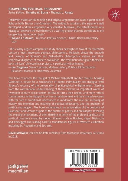 This book compares the thought of Michael Oakeshott and Leo Strauss, bringing Oakeshott's desire for a renaissance of poetic individuality into dialogue with Strauss's recovery of the universality of philosophical enlightenment. Starting from the conventional understanding of these thinkers as important voices of twentieth-century conservatism, McIlwain traces their deeper and more radical commitments to the highpoints of human achievement and their shared concerns with the fate of traditional inheritances in modernity, the role and meaning of history, the intention and meaning of political philosophy, and the problem of politics and religion. The book culminates in an articulation of the positions of Oakeshott and Strauss as part of the quarrel of poetry and philosophy, revealing the ongoing implications of their thinking in terms of the profound spiritual and political questions raised by modern thinkers such as Hobbes, Hegel, Nietzsche and Heidegger and leading back to foundational figures of Western civilization including St. Augustine and Socrates.
