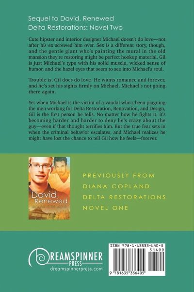 Sequel to David, RenewedDelta Restorations: Novel Two Cute hipster and interior designer Michael doesn't do love-not after his ex screwed him over. Sex is a different story, though, and the gentle giant who's painting the mural in the old mansion they're restoring might be perfect hookup material. Gil is just Michael's type with his solid muscle, wicked sense of humor, and the hazel eyes that seem to see into Michael's soul. Trouble is, Gil does do love. He wants romance and forever, and he's set his sights firmly on Michael. Michael's not going there again. Yet when Michael is the victim of a vandal who's been plaguing the men working for Delta Restoration, Renovation, and Design, Gil is the first person he tells. No matter how he fights it, it's becoming harder and harder to deny he's crazy about the guy-even if that thought terrifies him. But the true fear sets in when the criminal behavior escalates, and Michael realizes he might have lost the chance to tell Gil how he feels-forever.