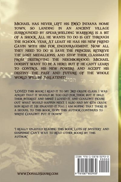 "Amazing, intriguing adventure. I read this book prior to reading to my 3rd grade class." Michael has never left his 1960 Indiana home town, so landing in an ancient village surrounded by spear-wielding warriors is a bit of a shock. All he wants to do is get through the school year. At least he has his new friend Gavin with him for encouragement. Now all they need to do is save the princess, retrieve the lost medallions, and stop their classmate from destroying the neighborhood. Michael doesn't want to be a hero, but if he can't learn to control his new powers and accept his destiny the past and future of the whole world will be threatened. "I could not put the book down. I read the book to my class, they loved it. They could not wait to find out what was going to happen next. The book keeps the reader wanting to know more. I did not want the end to come because I wanted to know what was next. For the author's first published book it is wonderful. Not just for young readers, but adults will truly enjoy it too. Can't wait for the next book from this promising author." - Mrs. G