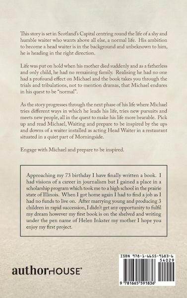 This story is set in Scotland's Capital centring round the life of a shy and humble waiter who wants above all else, a normal life. His ambition to become a head waiter is in the background and unbeknown to him, he is heading in the right direction. Life was put on hold when his mother died suddenly and as a fatherless and only child, he had no remaining family. Realising he had no one had a profound effect on Michael and the book takes you through the trials and tribulations, not to mention dramas, that Michael endures in his quest to be "normal". As the story progresses through the next phase of his life where Michael tries different ways in which he leads his life, tries new pursuits and meets new people, all in the quest to make his life more bearable. Pick up and read Michael, Waiting and prepare to be inspired by the ups and downs of a waiter installed as acting Head Waiter in a restaurant situated in a quiet part of Morningside. Engage with Michael and prepare to be inspired.