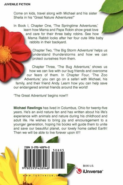 Come on kids, travel along with Michael and his sister Sheila in his "Great Nature Adventures!" In Book I, Chapter One, 'The Springtime Adventures,' learn how Mama and Papa Robin show great love and care for their three baby robins. See how Mama Rabbit looks after her four cute little baby rabbits in their backyard. Chapter Two, 'The Big Storm Adventure' helps us understand thunderstorms and how we can protect ourselves from them. Chapter Three, 'The Bug Adventure,' shows us how we can live with our bug friends and overcome our fears of them. In Chapter Four, 'The Zoo Adventure,' you can go on a safari with Michael, his family, and their friend Andy. Learn how you can help save our endangered animal friends around the world! 'The Great Adventure' begins now!!!