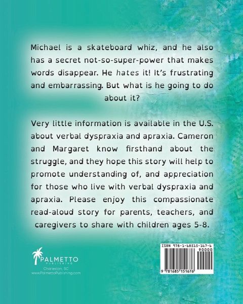 Michael is a skateboard whiz, and he also has a secret not-so-super-power that makes words disappear, and he hates it! It's frustrating and embarrassing. But what is he going to do about it? Very little information is available in the U.S. about verbal dyspraxia and apraxia. Cameron and Margaret know firsthand about the struggle, and they hope this story will help to promote understanding of, and appreciation for those who live with verbal dyspraxia and apraxia. A compassionate read-aloud story for parents, teachers, and caregivers to share with children ages 5-8.