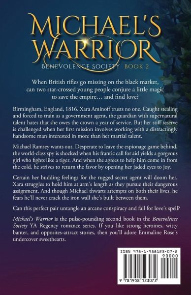 When British rifles go missing on the black market, can two star-crossed young people conjure a little magic to save the empire... and find love? Birmingham, England, 1816. Xara Aminoff trusts no one. Caught stealing and forced to train as a government agent, the guardian with supernatural talent hates that she owes the crown a year of service. But her stiff reserve is challenged when her first mission involves working with a distractingly handsome man interested in more than her martial talent. Michael Ramsey wants out. Desperate to leave the espionage game behind, the world-class spy is shocked when his frantic call for aid yields a gorgeous girl who fights like a tiger. And when she agrees to help him come in from the cold, he strives to return the favor by opening her jaded eyes to joy. Certain her budding feelings for the rugged secret agent will doom her, Xara struggles to hold him at arm's length as they pursue their dangerous assignment. And though Michael thwarts attempts on both their lives, he fears he'll never crack the iron wall she's built between them. Can this perfect pair untangle an arcane conspiracy and fall for love's spell? Michael's Warrior is the pulse-pounding second book in the Benevolence Society YA Regency romance series. If you like strong heroines, witty banter, and opposites-attract stories, then you'll adore Emmaline Rose's undercover sweethearts.
