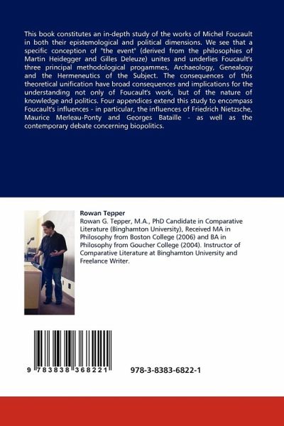 This book constitutes an in-depth study of the works of Michel Foucault in both their epistemological and political dimensions. We see that a specific conception of "the event" (derived from the philosophies of Martin Heidegger and Gilles Deleuze) unites and underlies Foucault's three principal methodological progammes, Archaeology, Genealogy and the Hermeneutics of the Subject. The consequences of this theoretical unification have broad consequences and implications for the understanding not only of Foucault's work, but of the nature of knowledge and politics. Four appendices extend this study to encompass Foucault's influences - in particular, the influences of Friedrich Nietzsche, Maurice Merleau-Ponty and Georges Bataille - as well as the contemporary debate concerning biopolitics.