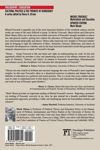 "Olssen ! brings Foucault to life and sheds new light on understanding his work...Educationalists and scholars across the disciplines will welcome this interpretation of Foucault." Michael A. Peters, University of Glasgow "Olssen distills in brilliant and succinct language the core of Foucault's most important insights. This is a book that every student should read in order to understand how to link theory to practice, and educational thought to legacy and work of one of Europe's great thinkers." Henry Giroux, McMaster University Michel Foucault is arguably one of the most important thinkers of the twentieth century, and his works are some of the most difficult to grasp. Mark Olssen offers an accessible overview of Foucault's thought, putting into context the relevance of Foucault's ideas. Olssen adds important new insights to Foucault scholarship by bringing to light the influences of other thinkers such as Marx, Nietzsche, Gramsci, Habermas, and others on Foucault's development as a thinker, and their influence on the deep historical materialist strand that grounds and uniquely characterizes so much of Foucault's thought.