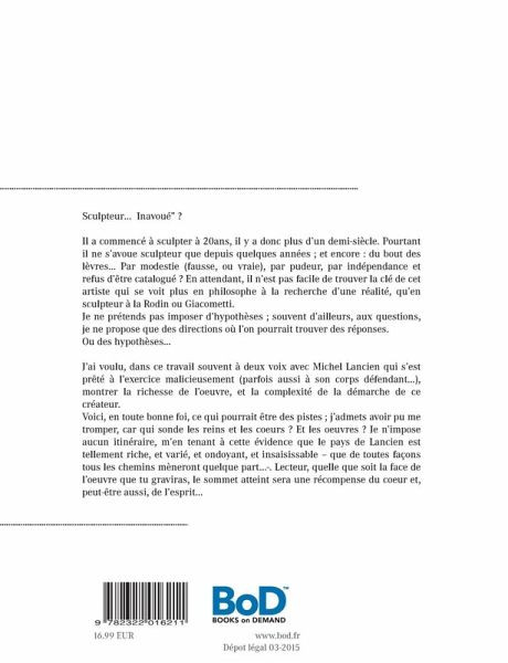 Sculpteur... " Inavoué" ?Il a commencé à sculpter à 20ans, il y a donc plus d'un demi-siècle. Pourtant il ne s'avoue sculpteur que depuis quelques années ; et encore : du bout des lèvres... Par modestie (fausse, ou vraie), par pudeur, par indépendance et refus d'être catalogué ? En attendant, il n'est pas facile de trouver la clé de cet artiste qui se voit plus en philosophe à la recherche d'une réalité, qu'en sculpteur à la Rodin ou Giacometti.Je ne prétends pas imposer d'hypothèses ; souvent d'ailleurs, aux questions, je ne propose que des directions où l'on pourrait trouver des réponses.Ou des hypothèses...J'ai voulu, dans ce travail souvent à deux voix avec Michel Lancien qui s'est prêté à l'exercice malicieusement (parfois aussi à son corps défendant...), montrer la richesse de l'oeuvre, et la complexité de la démarche de ce créateur.Voici, en toute bonne foi, ce qui pourrait être des pistes ; j'admets avoir pu me tromper, car qui sonde les reins et les coeurs ? Et les oeuvres ? Je n'impose aucun itinéraire, m'en tenant à cette évidence que le pays de Lancien est tellement riche, et varié, et ondoyant, et insaisissable - que de toutes façons tous les chemins mèneront quelque part...-. Lecteur, quelle que soit la face de l'oeuvre que tu graviras, le sommet atteint sera une récompense du coeur et, peut-être aussi, de l'esprit...A.van Hecke