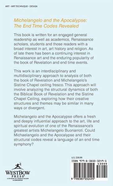 Michelangelo and the Apocalypse: The End Time Codes Revealed This book is written for an engaged general readership as well as academics, Renaissance scholars, students and those readers with a broad interest in art, art history and religion. As of late there has been a continuing interest in Renaissance art and the enduring popularity of the book of Revelation and end time events. This work is an interdisciplinary and multidisciplinary approach to analysis of both the book of Revelation and Michelangelo's Sistine Chapel ceiling fresco. This approach will involve analyzing the structural dynamics of both the Biblical Book of Revelation and the Sistine Chapel Ceiling, exploring how their creative structures and themes may be similar in many ways or divergent. Michelangelo and the Apocalypse offers a fresh and deeply influential approach to the art, life and spiritual evolution of one of the Renaissance's greatest artists Michelangelo Buonarroti. Could Michaelangelo and the Apocalypse and their structural codes reveal a language of an end time symphony?