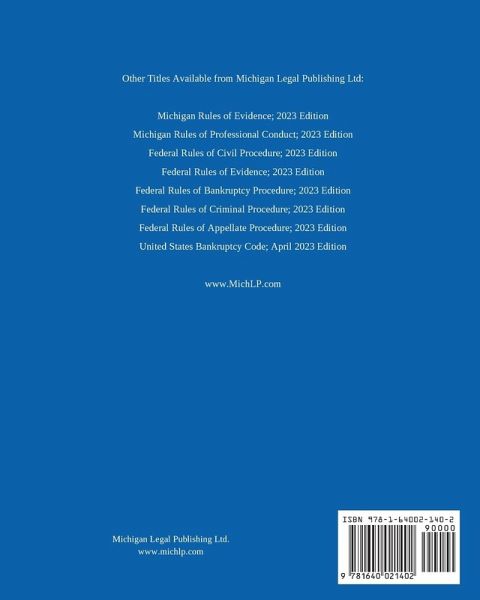 This edition of the full Michigan Court Rules is updated through February 1, 2023. Included are the rules of civil procedure, criminal procedure, probate procedure, appellate procedure, and more. Contents:Chapter 1; General Provisions Chapter 2; Civil Procedure Chapter 3; Special Proceedings and Actions Chapter 4; District Court Chapter 5; Probate Court Chapter 6; Criminal Procedure Chapter 7; Appellate Rules Chapter 8; Administrative Rules of Court Chapter 9; Professional Disciplinary Proceedings