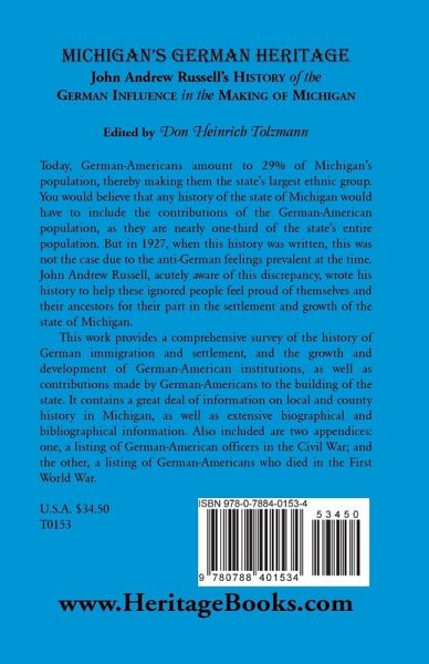 Today, German-Americans amount to 29% of Michigan's population, thereby making them the state's largest ethnic group. You would believe that any history of the state of Michigan would have to include the contributions of the German-American population, as they are nearly one-third of the state's entire population. But in 1927, when this history was written, this was not the case due to the anti-German feelings prevalent at the time. John Andrew Russell, acutely aware of this discrepancy, wrote his history to help these ignored people feel proud of themselves and their ancestors for their part in the settlement and growth of the state of Michigan. This work provides a comprehensive survey of the history of German immigration and settlement, and the growth and development of German-American institutions, as well as contributions made by German-Americans to the building of the state. It contains a great deal of information on local and county history in Michigan, as well as extensive biographical and bibliographical information. Also included are two appendices: one, a listing of German-American officers in the Civil War; and the other, a listing of German-Americans who died in the First World War.