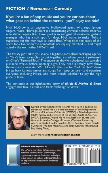 If you're a fan of pop music and you're curious about what goes on behind the cameras - you'll enjoy this ride! GOLD Winner 2023 IPA Awards, Finalist 2023 Amor Romance Novel Awards, The BookFest Awards Spring 2023 Silver Mick McGraw is an aggressive Hollywood agent who reps famous singers. Moira Halimi-Joubert is a headstrong criminal defense attorney who studied opera. Brad Davenport is an arrogant billionaire hedge-fund manager who has a soft spot for dogs. Mick wants to make Moira a superstar, but she may have to dump Brad. What does the battle of the sexes look like when the combatants are equally matched-and might actually like each other? #MeThree? The twisty plot takes you inside a big-time movieland packaging agency as Mick's team scrambles to put together a stadium concert patterned on Cher's "Farewell Tour." The superstar they've scheduled has canceled just nine weeks before opening night. They need a totally new show theme - and a new star. With Moira in the role, her "Follow This!" show brings back famous names and songs from pop culture - and surprises everyone, including Moira, who must decide whether to pay the high price of fame. The contentious but lighthearted story of Mick & Moira & Brad engages this trio in a "full and frank exchange of views."