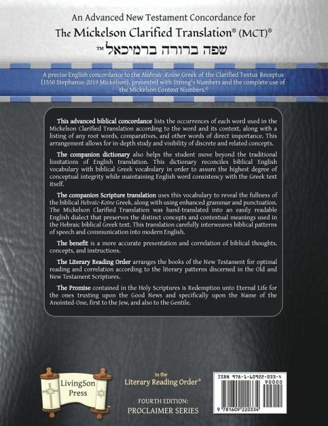 An Advanced New Testament Concordance for the Mickelson Clarified Translation (MCT).(R) A precise English concordance to the Hebraic-Koine Greek of the Clarified Textus Receptus(TM) (1550 Stephanus-2019 Mickelson), presented with Strong's Numbers and the complete use of the Mickelson Context Numbers.(c) * This advanced biblical concordance lists the occurrences of each word used in the Mickelson Clarified Translation according to the word and its context, along with a listing of any root words, comparatives, and other words of direct importance. This arrangement allows for in-depth study and visibility of discrete and related concepts. * The companion dictionary also helps the student move beyond the traditional limitations of English translation. This dictionary reconciles biblical English vocabulary with biblical Greek vocabulary in order to assure the highest degree of conceptual integrity while maintaining English word consistency with the Greek text itself. * The companion Scripture translation uses this vocabulary to reveal the fullness of the biblical Hebraic-Koine Greek, along with using enhanced grammar and punctuation. The Mickelson Clarified Translation was hand-translated into an easily readable English dialect that preserves the distinct concepts and contextual meanings used in the Hebraic biblical Greek text. This translation carefully interweaves biblical patterns of speech and communication into modern English. * The benefit is a more accurate presentation and correlation of biblical thoughts, concepts, and instructions. * The Literary Reading Order arranges the books of the New Testament for optimal reading and correlation according to the literary patterns discerned in the Old and New Testament Scriptures. * The Promise contained in the Holy Scriptures is Redemption unto Eternal Life for the ones trusting upon the Good News and specifically upon the Name of the Anointed-One, first to the Jew, and also to the Gentile.