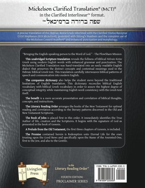 The Mickelson Clarified Translation (MCT)(R) in the Clarified Interlinear(TM) format. A precise translation of the Hebraic-Koine Greek interlined with the Clarified Textus Receptus(TM) (1550 Stephanus-2019 Mickelson), presented with Strong's numbers and the complete use of the Mickelson Context Numbers and enhanced punctuation and morphology. * This unabridged English translation reveals the fullness of biblical Hebraic-Koine Greek using modern English words with enhanced grammar and punctuation. The Mickelson Clarified Translation was hand-translated into an easily readable English dialect that preserves the distinct concepts and contextual meanings used in the Hebraic biblical Greek text. This translation carefully interweaves biblical patterns of speech and communication into modern English. * The companion dictionary also helps the student move beyond the traditional limitations of English translation. This dictionary reconciles biblical English vocabulary with biblical Greek vocabulary in order to assure the highest degree of conceptual integrity while maintaining English word consistency with the Greek text itself. * The benefit is a more accurate presentation and correlation of biblical thoughts, concepts, and instructions. * The Literary Reading Order arranges the books of the New Testament for optimal reading and correlation according to the literary patterns discerned in the Old and New Testament Scriptures. * The Book of John is placed first in this order. It immediately identifies the True Author of life, creation and the Scriptures. It begins with the signature of God as presented in the book of Genesis. * A Prelude from the Old Testament, the first three chapters of Genesis, is included. * The Promise contained herein is Redemption unto Eternal Life for the ones trusting upon the Good News and specifically upon the Name of the Anointed-One, first to the Jew, and also to the Gentile.