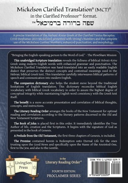 The Mickelson Clarified Translation (MCT)(R) in the Clarified Professor(TM) format (9.5pt). A precise translation of the Hebraic-Koine Greek of the Clarified Textus Receptus(TM) (1550 Stephanus-2019 Mickelson) presented with Strong's numbers and morphology and the complete use of the Mickelson Context Numbers and enhanced punctuation. * This unabridged English translation reveals the fullness of biblical Hebraic-Koine Greek using modern English words with enhanced grammar and punctuation. The Mickelson Clarified Translation was hand-translated into an easily readable English dialect that preserves the distinct concepts and contextual meanings used in the Hebraic biblical Greek text. This translation carefully interweaves biblical patterns of speech and communication into modern English. * The companion dictionary also helps the student move beyond the traditional limitations of English translation. This dictionary reconciles biblical English vocabulary with biblical Greek vocabulary in order to assure the highest degree of conceptual integrity while maintaining English word consistency with the Greek text itself. * The benefit is a more accurate presentation and correlation of biblical thoughts, concepts, and instructions. * The Literary Reading Order arranges the books of the New Testament for optimal reading and correlation according to the literary patterns discerned in the Old and New Testament Scriptures. * The Book of John is placed first in this order. It immediately identifies the True Author of life, creation and the Scriptures. It begins with the signature of God as presented in the book of Genesis. * A Prelude from the Old Testament, the first three chapters of Genesis, is included. * The Promise contained herein is Redemption unto Eternal Life for the ones trusting upon the Good News and specifically upon the Name of the Anointed-One, first to the Jew, and also to the Gentile.