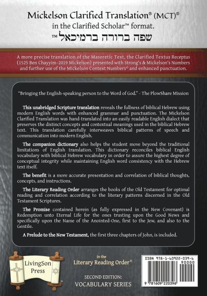The Mickelson Clarified Translation (MCT)(R) in the Clarified Scholar(TM) format (9.5pt). A more precise translation of the Hebrew and Aramaic Masoretic Text, the Clarified Textus Receptus(TM) (1525 Ben Chayyim-2019 Mickelson) presented with Strong's and Mickelson's Numbers and further use of the Mickelson Context Numbers and enhanced punctuation. * This unabridged Scripture translation reveals the fullness of biblical Hebrew using modern English words with enhanced grammar and punctuation. The Mickelson Clarified Translation was hand-translated into an easily readable English dialect that preserves the distinct concepts and contextual meanings used in the biblical Hebrew text. This translation carefully interweaves biblical patterns of speech and communication into modern English. * The companion dictionary also helps the student move beyond the traditional limitations of English translation. This dictionary reconciles biblical English vocabulary with biblical Hebrew vocabulary in order to assure the highest degree of conceptual integrity while maintaining English word consistency with the Hebrew text itself. * The benefit is a more accurate presentation and correlation of biblical thoughts, concepts, and instructions. * The Literary Reading Order arranges the books of the Old Testament for optimal reading and correlation according to the literary patterns discerned in the Old Testament Scriptures. * The Promise contained herein (as fully expressed in the New Covenant) is Redemption unto Eternal Life for the ones trusting upon the Good News and specifically upon the Name of the Anointed-One, first to the Jew, and also to the Gentile. * A Prelude to the New Testament, the first three chapters of John, is included.