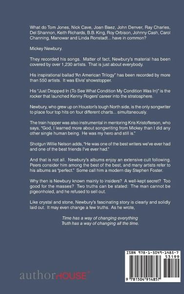 " What do Tom Jones, Nick Cave, Joan Baez, John Denver, Ray Charles, Del Shannon, Keith Richards, B.B. King, Roy Orbison, Johnny Cash, Carol Channing, Manowar and Linda Ronstadt... have in common? Mickey Newbury. They recorded his songs. Matter of fact, Newbury's material has been covered by over 1,230 artists. That is just about everybody. His inspirational ballad ""An American Trilogy"" has been recorded by more than 550 artists. It was Elvis' showstopper. His ""Just Dropped In (To See What Condition My Condition Was In)"" is the rocker that launched Kenny Rogers' career into the stratosphere. Newbury, who grew up on Houston's tough North side, is the only songwriter to place four top hits on four different charts... simultaneously. The train hopper was also instrumental in mentoring Kris Kristofferson, who says, ""God, I learned more about songwriting from Mickey than I did any other single human being. He was my hero and still is."" Shotgun Willie Nelson adds, ""He was one of the best writers we've ever had and one of the best friends I've ever had."" And that is not all. Newbury's albums enjoy an extensive cult following. Peers consider him among the best of the best, and many artists refer to his albums as ""perfect."" Some call him a modern day Stephen Foster. Why then is Newbury known mainly to insiders? A well-kept secret? Too good for the masses? Two truths can be stated: The man cannot be pigeonholed, and he refused to sell out. Like crystal and stone, Newbury's fascinating story is clearly and solidly laid out. It may even change a few truths. As he wrote, Time has a way of changing everything Truth has a way of changing all the time."