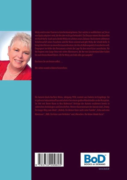Micky wird in einer Taverne in Griechenland geboren. Dort wächst er wohlbehütet auf, bis er von Opala adoptiert wird, die ihn aber nicht gut behandelt. Ein Ehepaar nimmt ihn daraufhin mit Nach Korfu-Stadt und schenkt Micky ein schönes neues Zuhause. Nach einem schlimmen Verkehrsunfall seines Frauchens wird ihr Mann wütend und gibt Micky die Schuld dafür. Er bringt den Kleinen zu einem Restaurantbesitzer, der ihn als Nahrungsmittel verarbeiten will. Eingesperrt im Keller des Restaurants scheint die Lage für den roten Kater aussichtslos. Für ihn beginnt eine lange Reise mit vielen Abenteuern, die ihn von Griechenland über Italien bis nach Deutschland führen. Ob für Micky am Ende alles gut ausgeht? Das lesen Sie am besten selbst ...Mit vielen wunderschönen KatzenfotosDie Autorin Gisela Kurfürst-Meins, Jahrgang 1958, stammt aus Zwönitz im Erzgebirge. Sie ist gelernte Industriekauffrau und arbeitet bei einem großen Münzhändler an der Rezeption. Sie lebt mit ihrem Mann in Neu Wulmstorf. Beiträge der Autorin erschienen bereits in zahlreichen Anthologien und Zeitschriften. Weitere Katzenromane der Autorin sind: "Emmy. Ein langer Weg zum Glück", "Mohrly. Ein kleiner Kater sucht seine Familie", "Felix und seine Abenteuer", "Willi. Ein Kater zum Verlieben" und "Mienchen. Die kleine blinde Katze".