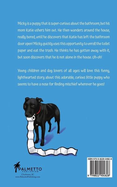 Micky is a puppy that is super-curious about the bathroom, but his mom Katie ushers him out. He then wanders around the house, really bored, until he discovers that Katie has left the bathroom door open! Micky quickly uses this opportunity to unroll the toilet paper and eat the trash. He thinks he has gotten away with it, but soon discovers that he is not alone in the house. Uh-oh! Young children and dog lovers of all ages will love this funny, lighthearted story about this adorable, curious little puppy who seems to have a nose for finding mischief wherever he goes!