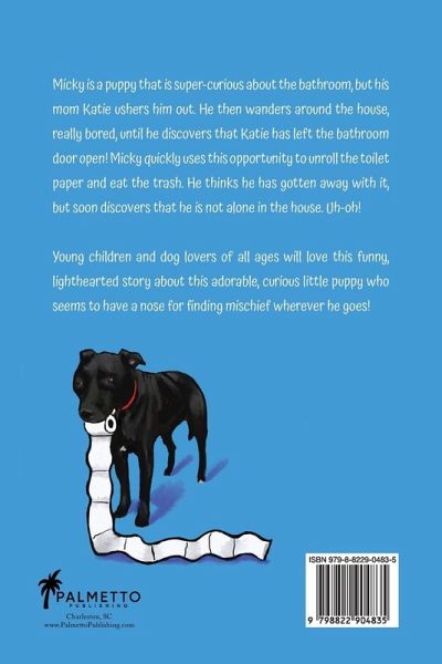 Micky is a puppy that is super-curious about the bathroom, but his mom Katie ushers him out. He then wanders around the house, really bored, until he discovers that Katie has left the bathroom door open! Micky quickly uses this opportunity to unroll the toilet paper and eat the trash. He thinks he has gotten away with it, but soon discovers that he is not alone in the house. Uh-oh! Young children and dog lovers of all ages will love this funny, lighthearted story about this adorable, curious little puppy who seems to have a nose for finding mischief wherever he goes!