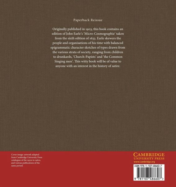Originally published in 1903, this book contains an edition of John Earle's 'Micro-Cosmographie' taken from the sixth edition of 1633. Earle skewers the people and organisations of his time with balanced epigrammatic character sketches of types drawn from the various strata of society, ranging from children to drunkards, 'Church-Papists' and 'the Common Singing men'. This witty book will be of value to anyone with an interest in the history of satire.