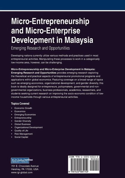 "This book focuses on the key aspects of micro-entrepreneurial activities and the effectiveness of supporting programs and policies on promoting micro-entrepreneurial activities in Malaysia. It also highlights the key issues of women micro-entrepreneurship, social capital and micro-entrepreneurship, entrepreneurial competencies, entrepreneurial knowledge and skills, entrepreneurial leadership, and the future directions of micro-entrepreneurship development programs and policies in Malaysia"--Provided by publisher.