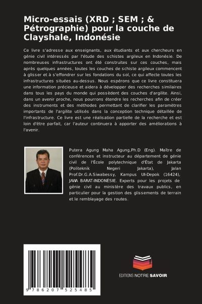 Ce livre s'adresse aux enseignants, aux étudiants et aux chercheurs en génie civil intéressés par l'étude des schistes argileux en Indonésie. De nombreuses infrastructures ont été construites sur ces couches, mais après quelques années, toutes les couches de schiste argileux commencent à glisser et à s'effondrer sur les fondations du sol, ce qui affecte toutes les infrastructures situées au-dessus. Nous espérons que ce livre constituera une information précieuse et aidera à développer des recherches similaires dans tous les pays du monde qui possèdent des couches d'argilite. Ainsi, dans un avenir proche, nous pourrons étendre les recherches afin de créer des instruments et des méthodes permettant de clarifier les paramètres importants de l'argilite utilisés dans la conception technique détaillée de l'infrastructure. Ce livre est une réalisation partielle de la recherche et est loin d'être parfait, car l'auteur continuera à apporter des améliorations à l'avenir.