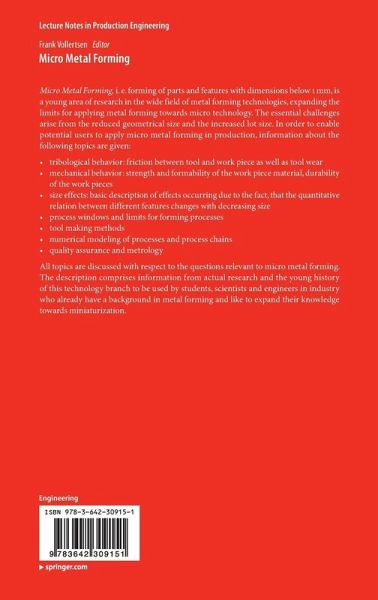 All topics are discussed with respect to the questions relevant to micro metal forming. The description comprises information from actual research and the young history of this technology branch to be used by students, scientists and engineers in industry who already have a background in metal forming and like to expand their knowledge towards miniaturization.