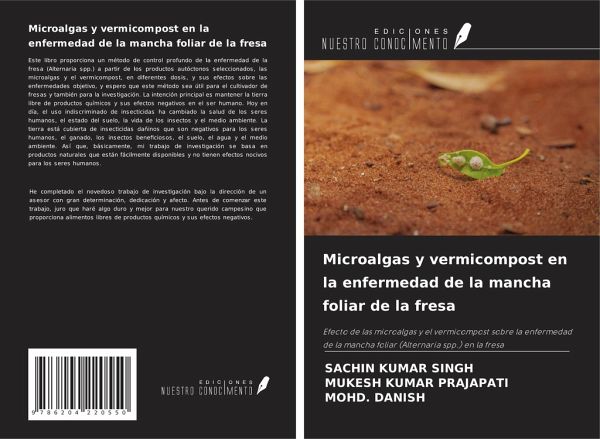 Este libro proporciona un método de control profundo de la enfermedad de la fresa (Alternaria spp.) a partir de los productos autóctonos seleccionados, las microalgas y el vermicompost, en diferentes dosis, y sus efectos sobre las enfermedades objetivo, y espero que este método sea útil para el cultivador de fresas y también para la investigación. La intención principal es mantener la tierra libre de productos químicos y sus efectos negativos en el ser humano. Hoy en día, el uso indiscriminado de insecticidas ha cambiado la salud de los seres humanos, el estado del suelo, la vida de los insectos y el medio ambiente. La tierra está cubierta de insecticidas dañinos que son negativos para los seres humanos, el ganado, los insectos beneficiosos, el suelo, el agua y el medio ambiente. Así que, básicamente, mi trabajo de investigación se basa en productos naturales que están fácilmente disponibles y no tienen efectos nocivos para los seres humanos.