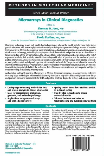 "Microarrays in Clinical Diagnostics ... is a collection of fifteen chapters by authors from both industry and academia, surveying current applications of microarray-based technologies in diagnostics ... . provides protocols in the successful style of the Methods in Molecular Biology series, with clarity and sufficient technical detail so that both novice and current microarray users are sure to benefit from this book." (Nicolas Winssinger, ChemMedChem, Issue 1, 2006)