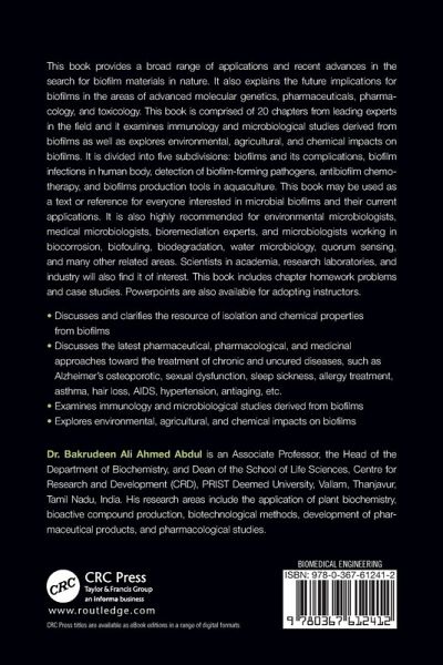 This book provides a broad range of applications and recent advances in the search for biofilm materials in nature. It also explains the future implications for biofilms in the areas of advanced molecular genetics, pharmaceuticals, pharmacology, and toxicology. This book is comprised of 20 chapters from leading experts in the field and it examines immunology and microbiological studies derived from biofilms as well as explores environmental, agricultural, and chemical impacts on biofilms. It is divided into five subdivisions: biofilms and its complications, biofilm infections in human body, detection of biofilm-forming pathogens, antibiofilm chemotherapy, and biofilms production tools in aquaculture. This book may be used as a text or reference for everyone interested in microbial biofilms and their current applications. It is also highly recommended for environmental microbiologists, medical microbiologists, bioremediation experts, and microbiologists working in biocorrosion, biofouling, biodegradation, water microbiology, quorum sensing, and many other related areas. Scientists in academia, research laboratories, and industry will also find it of interest. This book includes chapter homework problems and case studies. Powerpoints are also available for adopting instructors. Discusses and clarifies the resource of isolation and chemical properties from biofilms Discusses the latest pharmaceutical, pharmacological, and medicinal approaches toward the treatment of chronic and uncured diseases, such as Alzheimer's osteoporotic, sexual dysfunction, sleep sickness, allergy treatment, asthma, hair loss, AIDS, hypertension, antiaging, etc. Examines immunology and microbiological studies derived from biofilms Explores environmental, agricultural, and chemical impacts on biofilms. Dr. Bakrudeen Ali Ahmed Abdul is an Associate Professor, the Head of the Department of Biochemistry and Dean of the School of Life Sciences, Centre for Research and Development (CRD), PRIST Deemed University, Vallam, Thanjavur, Tamil Nadu, India. His research areas include the application of plant biochemistry, bioactive compound production, biotechnological methods, development of pharmaceutical products and pharmacological studies.