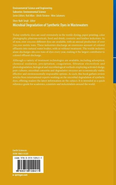 Although a variety of treatment technologies are available, including adsorption, chemical oxidation, precipitation, coagulation, filtration electrolysis and photodegradation, biological and microbiological methods employing activated sludge, pure cultures, microbial consortia and degradative enzymes are economically viable, effective and environmentally responsible options. As such, this book gathers review articles from international experts working on the microbial degradation of synthetic dyes, offering readers the latest information on the subject. It is intended as a quick reference guide for academics, scientists and industrialists around the world.