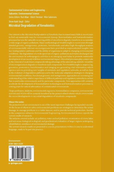 Our interest in the microbial biodegradation of xenobiotics has increased many folds in recent years to find out sustainable ways for environmental cleanup. Bioremediation and biotransformation processes harness the naturally occurring ability of microbes to degrade, transform or accumulate a wide range of organic pollutants. Major methodological breakthroughs in recent years through detailed genomic, metagenomic, proteomic, bioinformatic and other high-throughput analyses of environmentally relevant microorganisms have provided us unprecedented insights into key biodegradative pathways and the ability of organisms to adapt to changing environmental conditions. The degradation of a wide spectrum of organic pollutants and wastes discharged into the environment by anthropogenic activities is an emerging need today to promote sustainable development of our society with low environmental impact. Microbial processes play a major role in the removal of recalcitrant compounds takingadvantage of the astonishing catabolic versatility of microorganisms to degrade or transform such compounds. New breakthroughs in sequencing, genomics, proteomics, bioinformatics and imaging are generating vital information which opens a new era providing new insights of metabolic and regulatory networks, as well as clues to the evolution of degradation pathways and to the molecular adaptation strategies to changing environmental conditions. Functional genomic and metagenomic approaches are increasing our understanding of the relative importance of different pathways and regulatory networks tocarbon flux in particular environments and for particular compounds. New approaches will certainly accelerate the development of bioremediation technologies and biotransformation processes in coming years for natural attenuation of contaminated environments