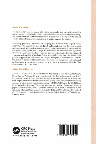 A complete overview of the technologies and products for microbial-based pest control. It documents the use of genetically altered Bt and transgenic crops, microbial formulations, and synergistic interactions of microbials with synthetic chemicals, as well as the management of Bt foliar applications and Bt genes in transgenic crops. The book includes case studies and pathogen, products and manufacturers indices.