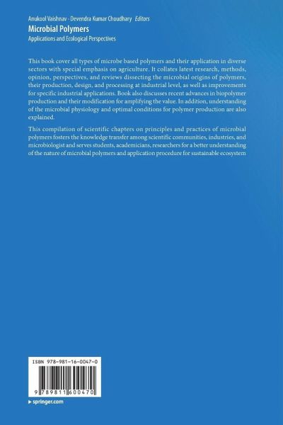 Chapter 1. The production and applications of microbial derived polyhydroxy butyrates.- Chapter 2. Fungal exopolysaccharides: types, production and application.- Chapter 3. Isolation and purification of microbial exopolysaccharides and their industrial applications.- Chapter 4. A review on properties and application of xanthan gum.- Chapter 5. Biosynthesis and characterization of poly-(3)-hydroxyalkanoic acid by Bacillus megaterium SF4 using different carbohydrates.- Chapter 6. Mushroom mycelia-based material: an environmental friendly alternative to synthetic packaging.- Chapter 7. An overview of microbial derived polyhydroxy butyrate (PHB): production and characterization.- Chapter 8. Insight of Biopolymers and applications of Polyhydroxyalkanoates.- Chapter 9. Microbial pigments and their application.- Chapter 10. Extracellular polymeric substances from agriculturally important microorganisms.- Chapter 11. Significance of bacterial polyhydroxy alkanoates in rhizosphere.- Chapter 12. Role of microbial biofilms in agriculture: perspectives on plant and soil health.- Chapter 13. Biological soil crusts to keep soil alive, rehabilitate degraded soil, and develop soil habitats.- Chapter 14. Fungal chitosan :the importance and beneficiation of this biopolymer in industrial and agriculture process.- Chapter 15. Role of microbial extracellular polymeric substances in soil fertility.- Chapter 16. Microbes derived exopolysaccharides play role in salt stress alleviation in plants.- Chapter 17. Microbial exopolysaccharides: structure and therapeutic properties.- Chapter 18. Microbial biopolymers: pharmaceutical, medical & biotechnological applications.- Chapter 19. Mycobacterium Biofilms synthesis, ultra structure and their perspectives in drug tolerance, environment and medicine.- Chapter 20. A comprehensive review on different microbial derived pigments and their multipurpose activities.- Chapter 21. Microbial polysaccharides with potential industrial applications: diversity, synthesis and their applications.- Chapter 22. Eco friendly microbial biopolymers: recent development, biodegradation and applications.- Chapter 23. Microbial biopolymers as an alternative construction binder.- Chapter 24. Genetic engineering approaches for high end application of biopolymers:Advances and future prospects.- Chapter 25. Microbial pigments: secondary metabolites with multifaceted roles.- Chapter 26. Bio-fermentative production of xanthan gum biopolymer and its application in petroleum sector.- Chapter 27. A comparative study on biodegradable packaging materials: current status and future prospects.- Chapter 28. Environmental implications of microbial bioplastics for a sustainable future.