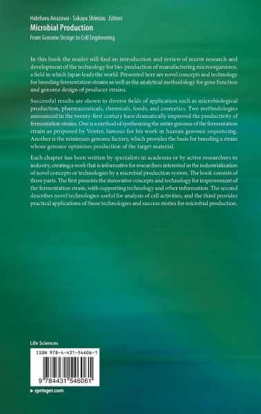 Microbial production: From genome design to cell surface engineering affords a comprehensive review of novel technology and approaches being implemented for manufacturing microorganisms, written by specialists in both academia and industry. This book is divided into three sections: the first includes technology for improvement of fermentation strains and many supporting technologies and information; the second examines novel technology useful for analysis of cell activities, analyzing gene function, and designing genomes of producer strains; and finally, a discussion of the practical application of the techniques and success case studies in many fields of bio-production, such as microbiological production, pharmaceuticals, chemicals, foods and cosmetics.