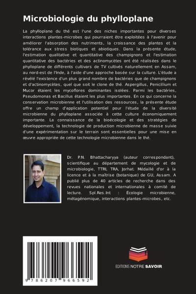 La phylloplane du thé est l'une des niches importantes pour diverses interactions plantes-microbes qui pourraient être exploitées à l'avenir pour améliorer l'absorption des nutriments, la croissance des plantes et la tolérance aux stress biotiques et abiotiques. Dans la présente étude, l'estimation qualitative et quantitative des champignons et l'estimation quantitative des bactéries et des actinomycètes ont été réalisées dans le phylloplane de différents cultivars de TV cultivés naturellement en Assam, au nord-est de l'Inde, à l'aide d'une approche basée sur la culture. L'étude a révélé l'existence d'un plus grand nombre de bactéries que de champignons et d'actinomycètes, quel que soit le clone de thé. Aspergillus, Penicillium et Mucor étaient les mycoflores dominantes isolées. Parmi les bactéries, Pseudomonas et Bacillus étaient les plus importantes. En ce qui concerne la conservation microbienne et l'utilisation des ressources, la présente étude offre un champ d'application potentiel pour l'étude de la diversité microbienne du phylloplane associée à cette culture économiquement importante. La connaissance de la bioécologie et des stratégies de développement, la technologie de production microbienne de masse suivie d'une expérimentation sur le terrain sont essentielles pour une mise en oeuvre appropriée de cette technologie microbienne dans le thé.