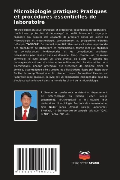 "Microbiologie pratique: pratiques et procédures essentielles de laboratoire - techniques, protocoles et dépannage" est méticuleusement conçu pour répondre aux besoins des étudiants de première année de licence en microbiologie et biotechnologie, conformément au programme d'études défini par TANSCHE. Ce manuel essentiel offre une exploration approfondie des procédures de laboratoire en microbiologie, fournissant aux étudiants les connaissances fondamentales et les compétences pratiques nécessaires pour réussir dans ce domaine. Conçu comme une ressource conviviale, le livre couvre un large éventail de sujets, y compris les techniques de culture microbienne, les méthodes de coloration et les tests biochimiques. Chaque procédure est présentée de manière claire et concise, accompagnée d'instructions et d'illustrations étape par étape pour faciliter la compréhension et la mise en oeuvre. En mettant l'accent sur l'apprentissage pratique, ce livre est un compagnon indispensable pour les étudiants qui se lancent dans le monde fascinant de la microbiologie.