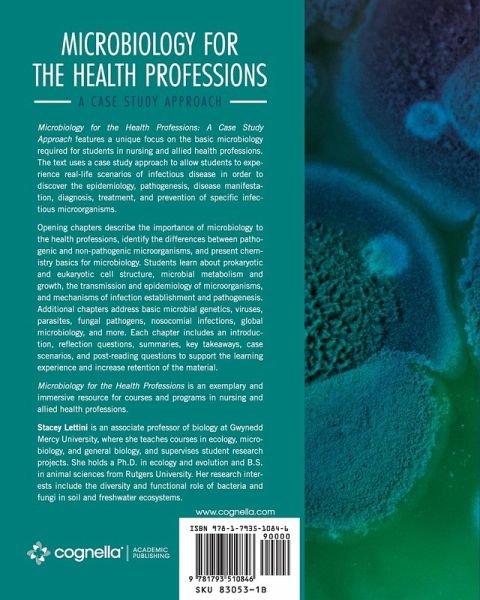 Microbiology for the Health Professions: A Case Study Approach features a unique focus on the basic microbiology required for students in nursing and allied health professions. The text uses a case study approach to allow students to experience real-life scenarios of infectious disease in order to discover the epidemiology, pathogenesis, disease manifestation, diagnosis, treatment, and prevention of specific infectious microorganisms. Opening chapters describe the importance of microbiology to the health professions, identify the differences between pathogenic and non-pathogenic microorganisms, and present chemistry basics for microbiology. Students learn about prokaryotic and eukaryotic cell structure, microbial metabolism and growth, the transmission and epidemiology of microorganisms, and mechanisms of infection establishment and pathogenesis. Additional chapters address basic microbial genetics, viruses, parasites, fungal pathogens, nosocomial infections, global microbiology, and more. Each chapter includes an introduction, reflection questions, summaries, key takeaways, case scenarios, and post-reading questions to support the learning experience and increase retention of the material. Microbiology for the Health Professions is an exemplary and immersive resource for courses and programs in nursing and allied health professions.