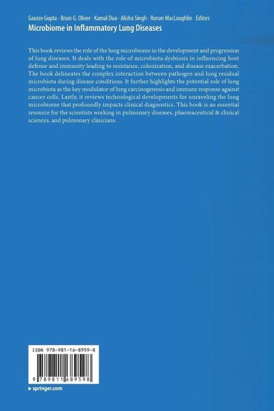 Introduction to Lung Diseases.- Introduction to Microbiome.- Role of Microbiome in Inflammation.- The interplay of microbiome, inflammation, and immunity in inflammatory lung diseases.- Microbiome in Asthma.- Microbiome in Chronic Obstructive Pulmonary Disease.- Microbiome in Asthma-COPD Overlap syndrome (ACO).- Microbiome in ARDS (Acute Respiratory Distress Syndrome).- Role of brain-gut- microbiome axis in Depression co-morbid with COPD or Asthma.- Microbiome in Lung Cancer.- Microbiome in Pulmonary Tuberculosis.- Lung Microbiome: Friend or Foe of Mycobacterium tuberculosis.- Microbiome in Idiopathic Pulmonary Fibrosis. Microbiome in SARS-Cov2 (Covid-19).- Status of the microbiome in SARS-Cov2 (Covid-19).- Microbiome in Influenza-A Virus Infection.- Microbiome in Upper Respiratory Tract Infection (URTI).- Challenges in understanding the lung microbiota.- Microbiome in Inflammatory Lung Diseases: Challenges and Future Prospects.- Microbiota targeted via nanotechnology for lung cancer therapy: Challenges and future perspectives.