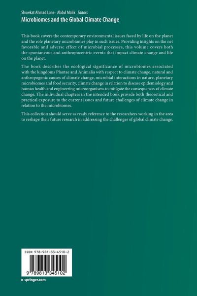 The book describes the ecological significance of microbiomes associated with the kingdoms Plantae and Animalia with respect to climate change, natural and anthropogenic causes of climate change, microbial interactions in nature, planetary microbiomes and food security, climate change in relation to disease epidemiology and human health and engineering microorganisms to mitigate the consequences of climate change. The individual chapters in the intended book provide both theoretical and practical exposure to the current issues and future challenges of climate change in relation to the microbiomes.