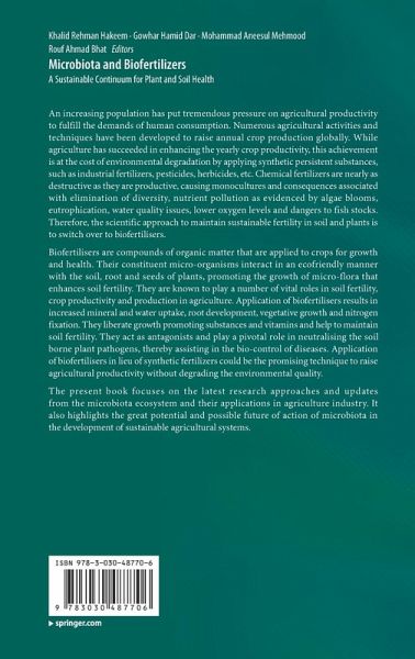 An increasing population has put tremendous pressure on agricultural productivity to fulfill the demands of human consumption. Numerous agricultural activities and techniques have been developed to raise annual crop production globally. While agriculture has succeeded in enhancing the yearly crop productivity, this achievement is at the cost of environmental degradation by applying synthetic persistent substances, such as industrial fertilizers, pesticides, herbicides, etc. Chemical fertilizers are nearly as destructive as they are productive, causing monocultures and consequences associated with elimination of diversity, nutrient pollution as evidenced by algae blooms, eutrophication, water quality issues, lower oxygen levels and dangers to fish stocks. Therefore, the scientific approach to maintain sustainable fertility in soil and plants is to switch over to biofertilisers. Biofertilisers are compounds of organic matter that are applied to crops for growth and health. Theirconstituent micro-organisms interact in an ecofriendly manner with the soil, root and seeds of plants, promoting the growth of micro-flora that enhances soil fertility. They are known to play a number of vital roles in soil fertility, crop productivity and production in agriculture. Application of biofertilisers results in increased mineral and water uptake, root development, vegetative growth and nitrogen fixation. They liberate growth promoting substances and vitamins and help to maintain soil fertility. They act as antagonists and play a pivotal role in neutralising the soil borne plant pathogens, thereby assisting in the bio-control of diseases. Application of biofertilisers in lieu of synthetic fertilizers could be the promising technique to raise agricultural productivity without degrading the environmental quality. The present book focuses on the latest research approaches and updates from the microbiota ecosystem and their applications in agriculture industry. It also highlightsthe great potential and possible future of action of microbiota in the development of sustainable agricultural systems.