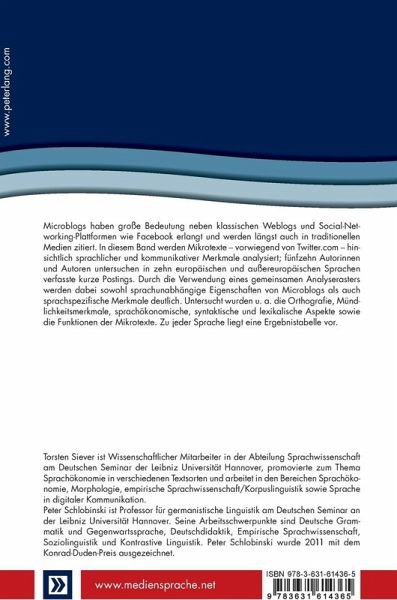 Microblogs haben große Bedeutung neben klassischen Weblogs und Social-Networking-Plattformen wie Facebook erlangt und werden längst auch in traditionellen Medien zitiert. In diesem Band werden Mikrotexte - vorwiegend von Twitter.com - hinsichtlich sprachlicher und kommunikativer Merkmale analysiert; fünfzehn Autorinnen und Autoren untersuchen in zehn europäischen und außereuropäischen Sprachen verfasste kurze Postings. Durch die Verwendung eines gemeinsamen Analyserasters werden dabei sowohl sprachunabhängige Eigenschaften von Microblogs als auch sprachspezifische Merkmale deutlich. Untersucht wurden u. a. die Orthografie, Mündlichkeitsmerkmale, sprachökonomische, syntaktische und lexikalische Aspekte sowie die Funktionen der Mikrotexte. Zu jeder Sprache liegt eine Ergebnistabelle vor.